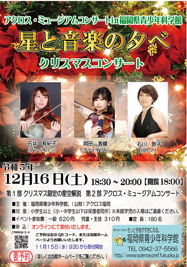 日時:令和7年12月20日(土)18:30~20:00(18:00開場) 2部構成 第1部 クリスマス限定の星空解説 第2部 アクロス・ミュージックキャラバン 《参加対象》 小学生以上(ただし小・中学生は保護者同伴) ※未就学児の入場はご遠慮ください 《参加費》 一般620円、児童・生徒310円 《定員》230名 《申し込み》11月20日(木)9:30よりオンラインにて受付開始 |