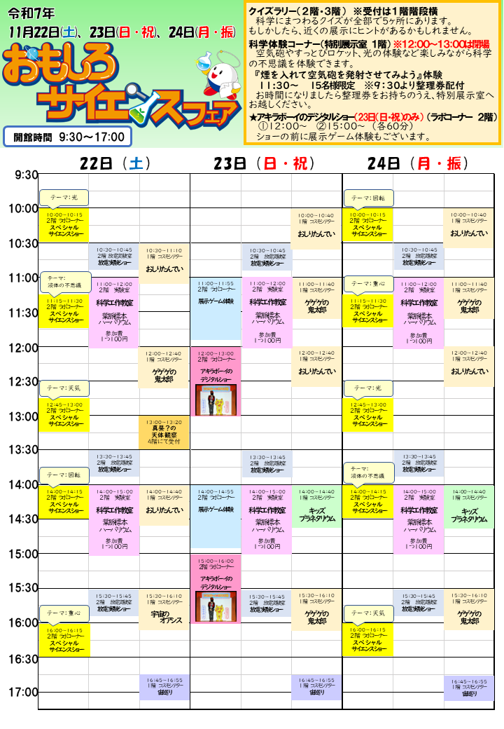 11月22日(土)・23日(日・祝)・24日(月・振) 楽しいイベントがいっぱいの特別な3日間 クリックすると大きく表示されます ※期間中の再入館はできません。ご理解のほど、よろしくお願いいたします。 真昼?の天体観察 13:00~13:20 キッズ★プラネタリウム