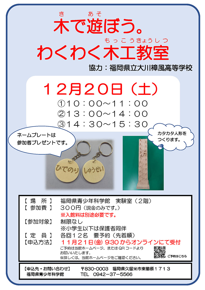 【 場 所 】 福岡県青少年科学館 実験室(2階)2)13:00~14:00